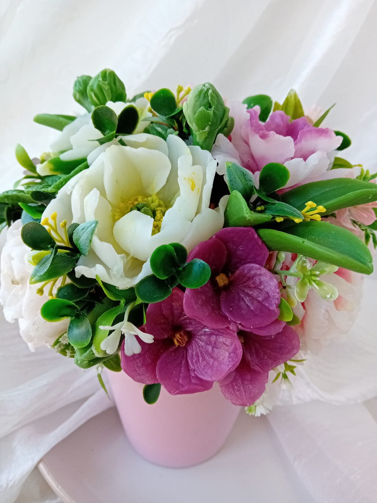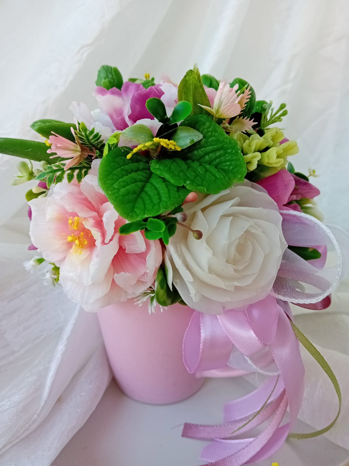 Ručne odlievané mydlové kvietky naaranžované v keramickom kvetináči s jemnou vôňou luxusného parfému. Výška dekorácie 19cm, obvod 44cm